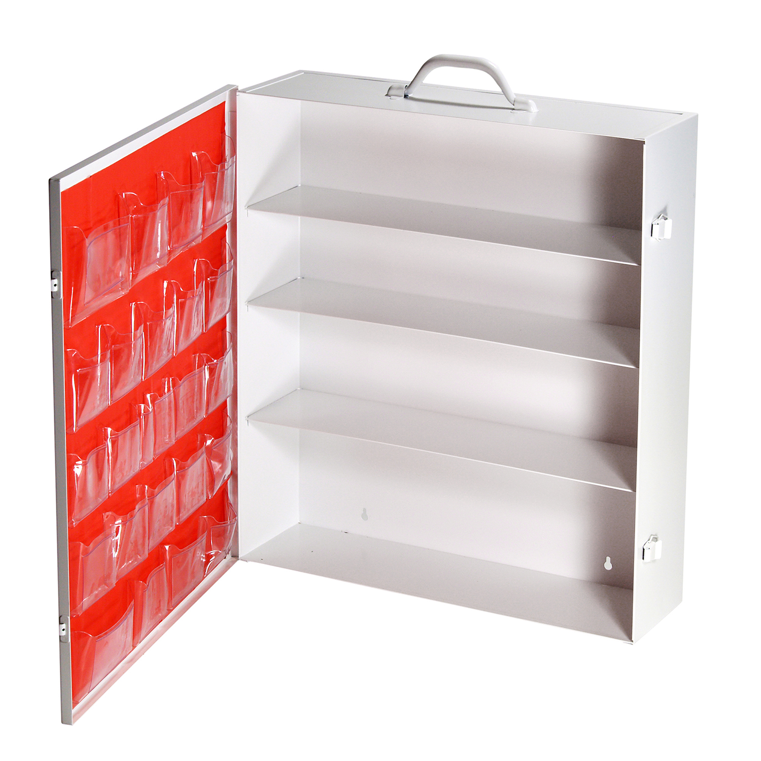22″H x 19″W x 5-1/2″D, wall-mountable, extra large metal cabinet with more space than the standard 4-shelf cabinet.