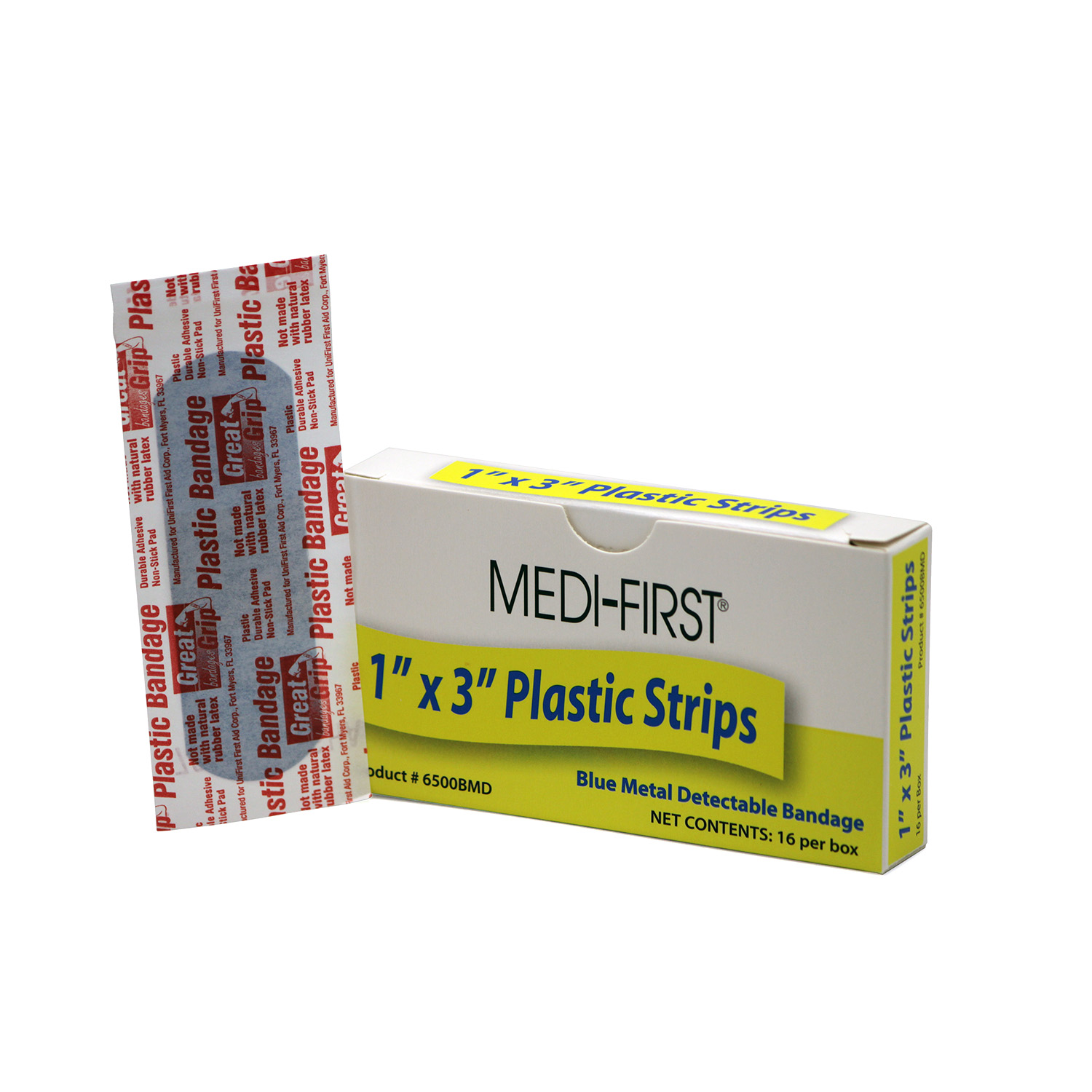 Specifically developed for use in food and restaurant prep, blue bandages are designed to be highly visible with a metal strip under the bandage pad.