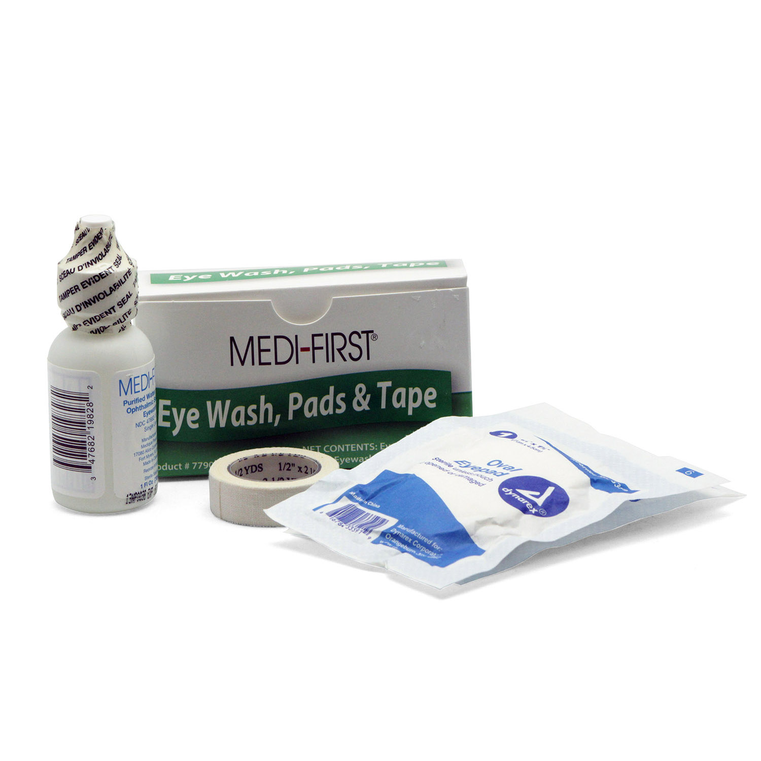 Contains: 1oz eye wash, 2 oval eye pads and adhesive tape.