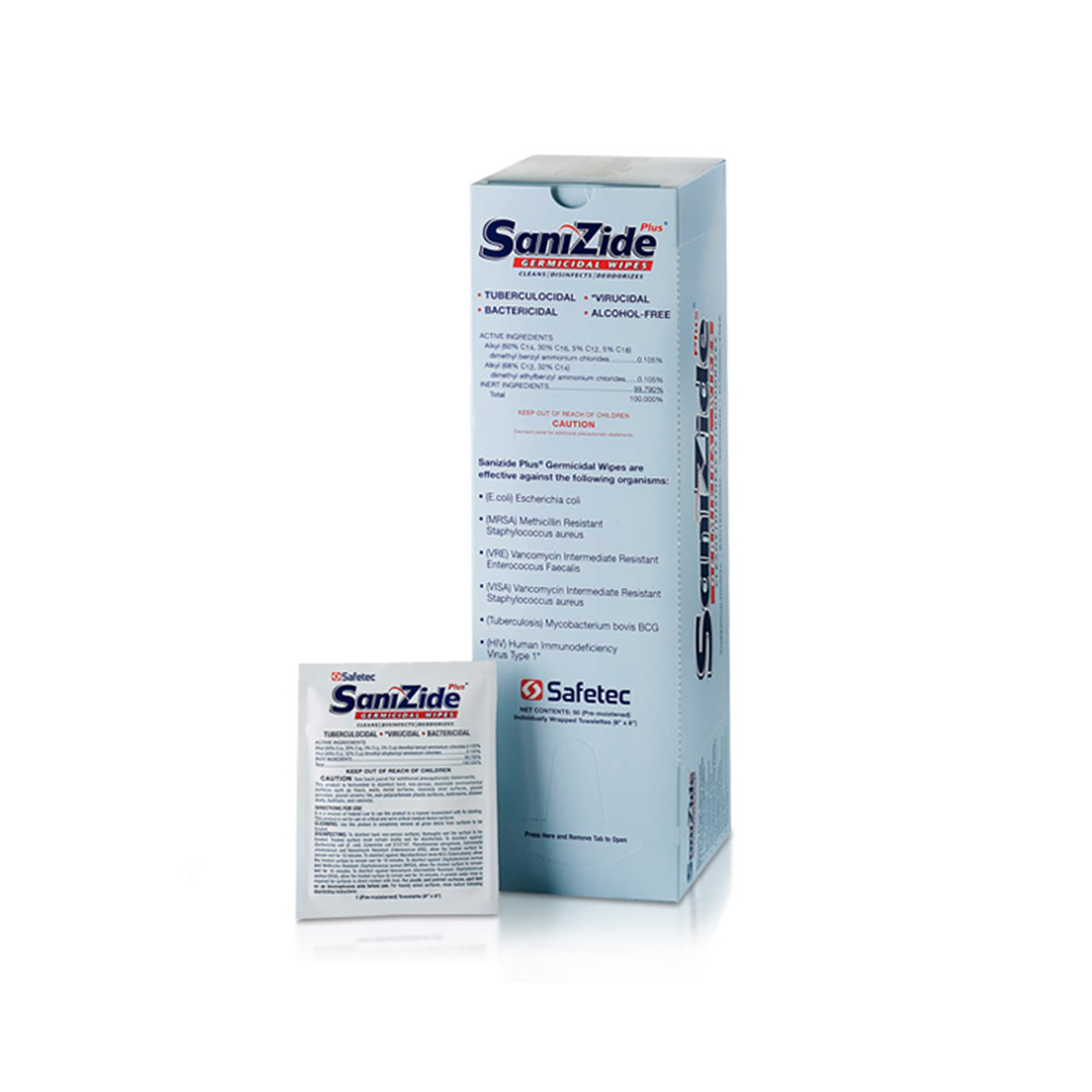SaniZide Plus® Germicidal Wipes are pre- saturated hard surface wipes. Kills TB, MRSA, VRE, E Coli and more in 10 minutes and HIV-1 in 2 minutes.