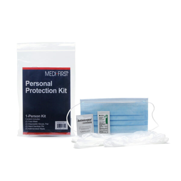 Kits contain face masks and gloves for individual protection against dangerous germs as well as antimicrobial wipes and hand sanitizer for disinfection of hands and surfaces.